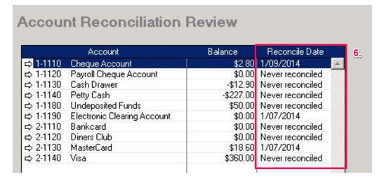 Cheque Account, Cash Drawer, Petty Cash and Visa have not be reconciled to current date.